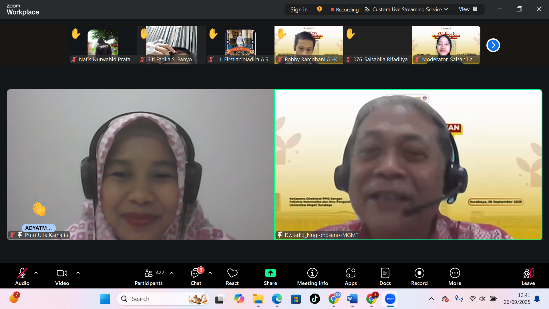 Surabaya, 26 September 2025 — Webinar yang dilaksanakan pada tanggal 26 September 2025 pukul 13.00–15.00 WIB melalui Zoom dan dihadiri 430 mahasiswa baru FEB 2025
